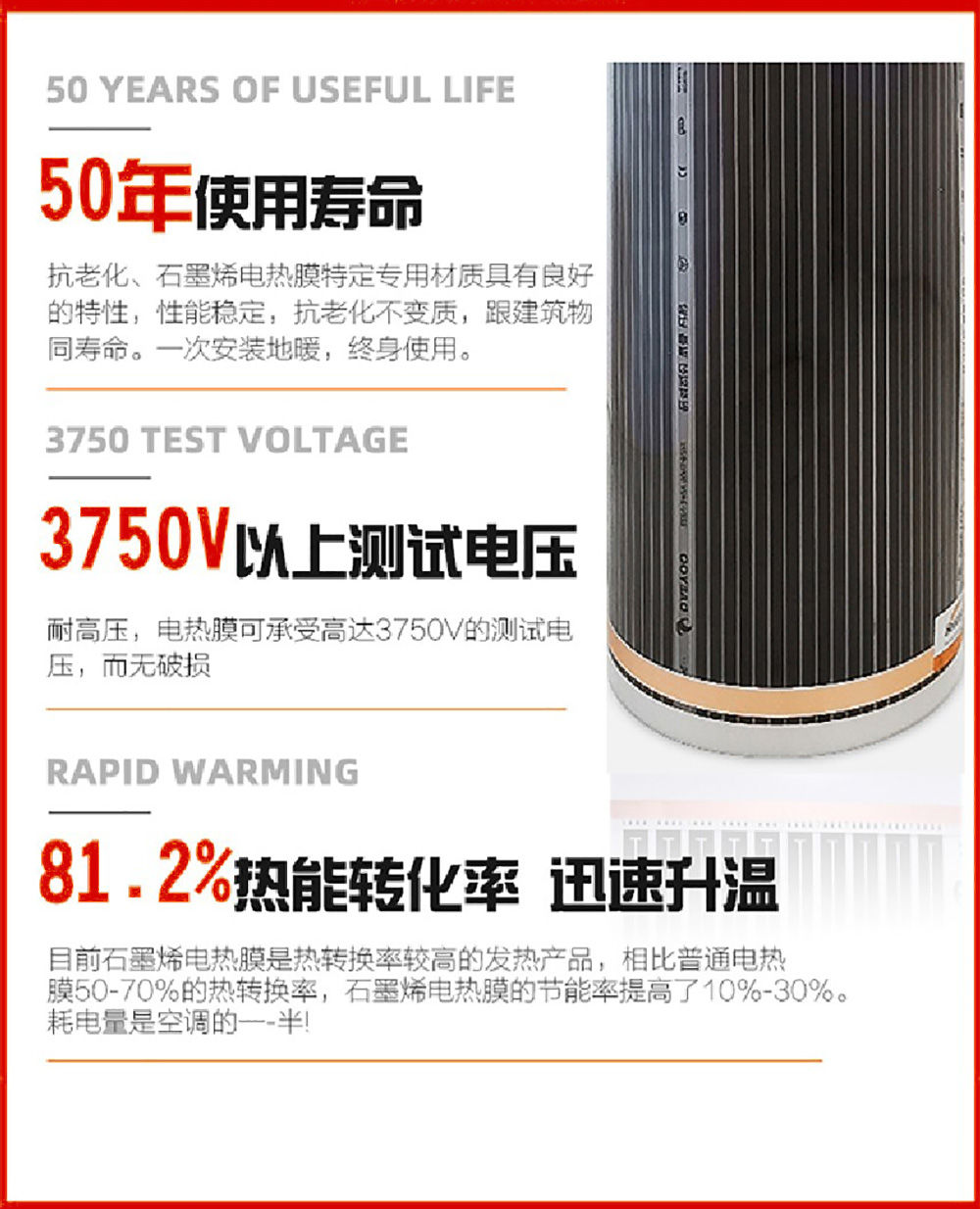 產(chǎn)品特點(diǎn):散熱均勻;遠(yuǎn)紅外輻射熱;鋪設(shè)簡(jiǎn)易